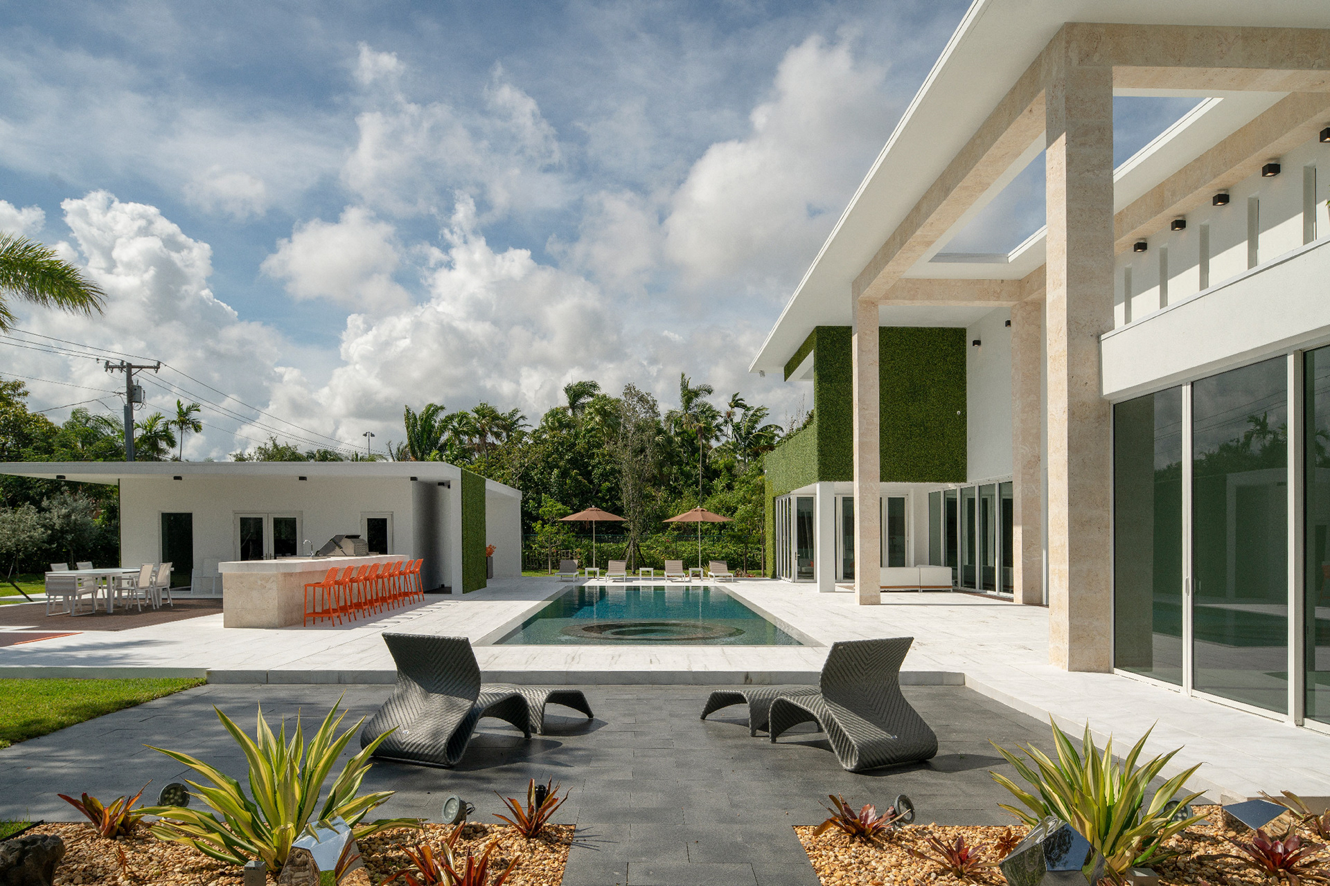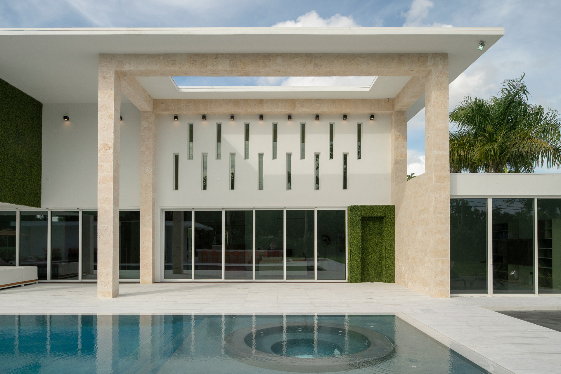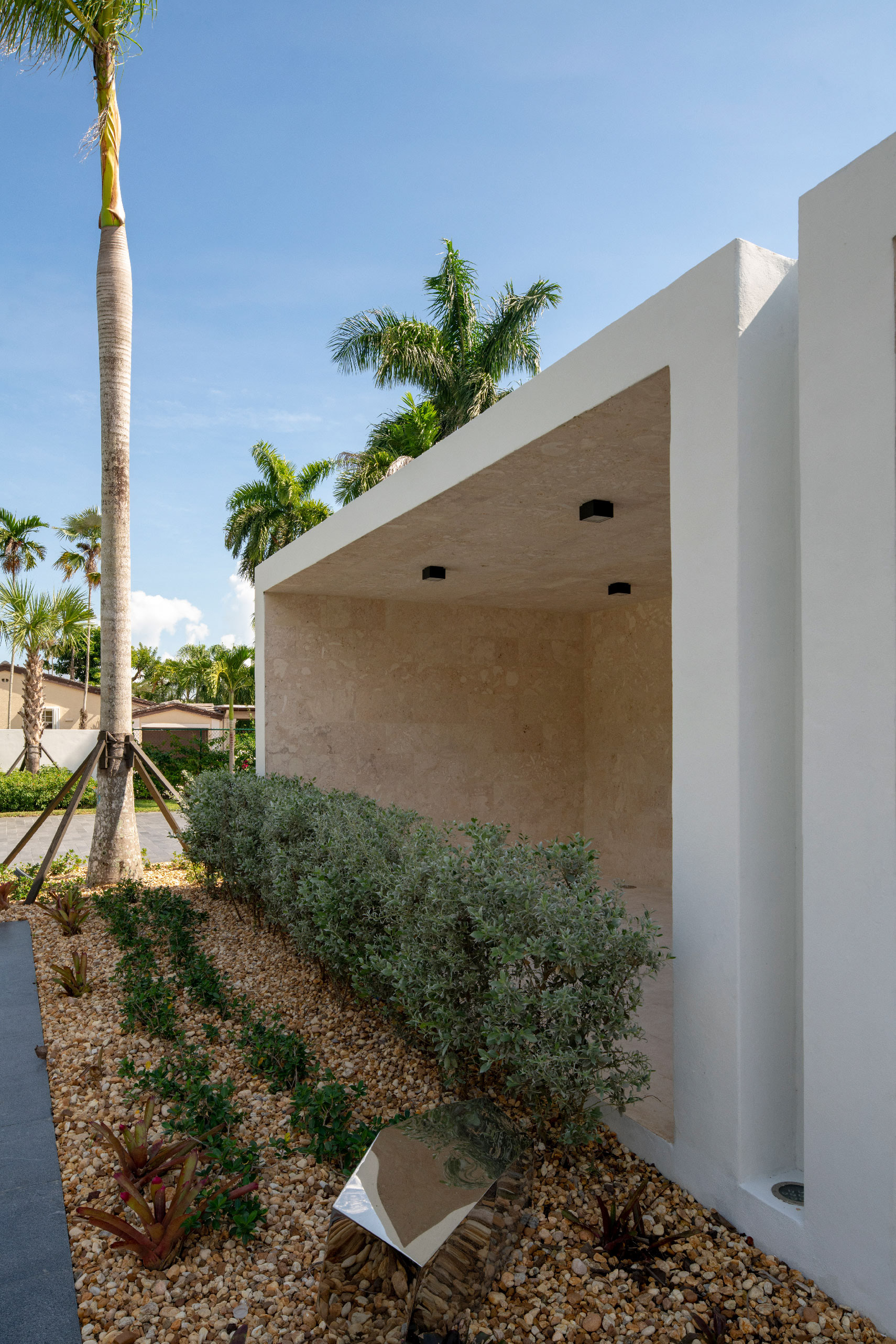 The home is a highly efficient with Insulated Concrete Forms (ICF) Solid concrete structure with 8 times the wall insulation as required by the strict Florida Building Code. There exterior oscillates between raw coral stone and stucco evoking a tropical motif. The interior introduces surfaces with contrasting wood and glass for its features sharp modern features. The kitchen, closets and cabinets were supplied by the famed Molteni & C of Italy who has made this home a portfolio home for their brand.