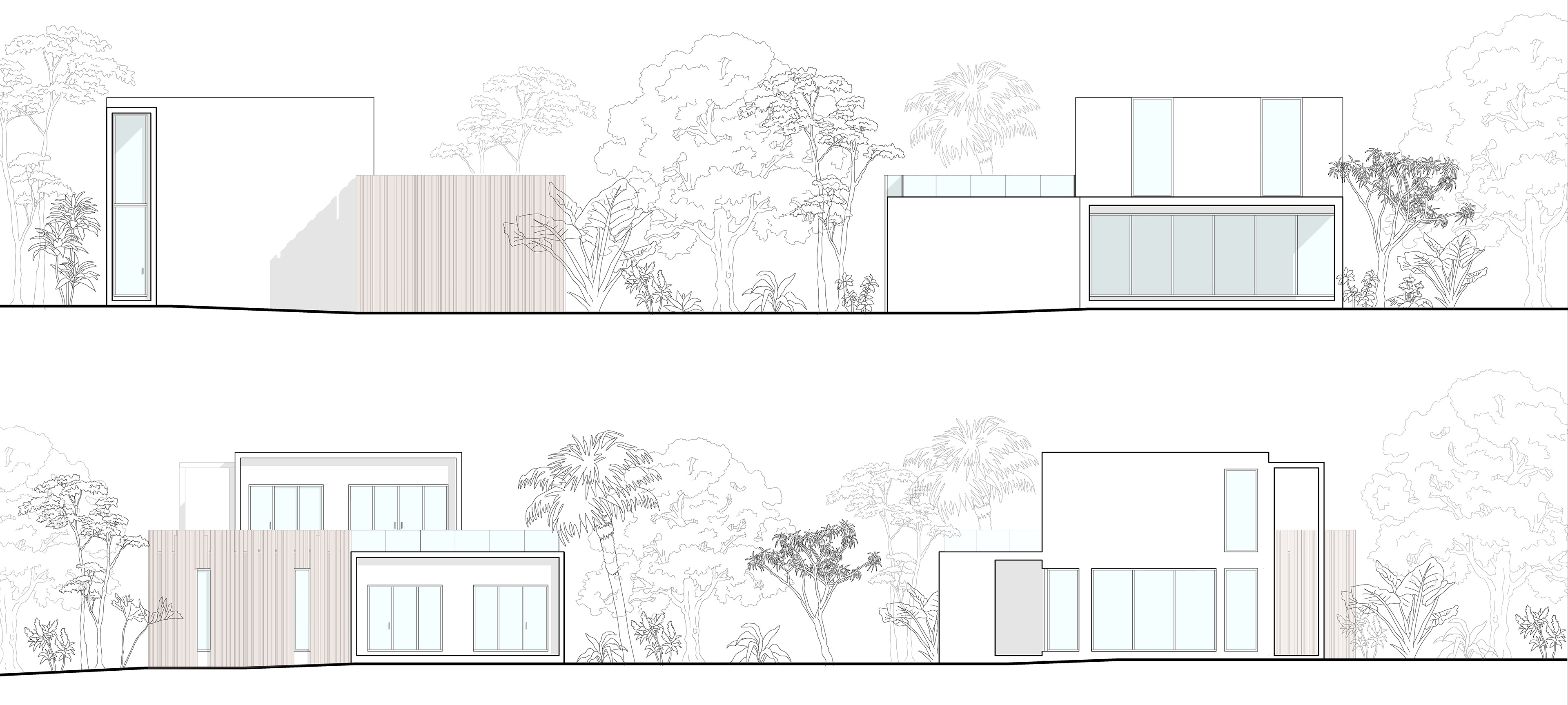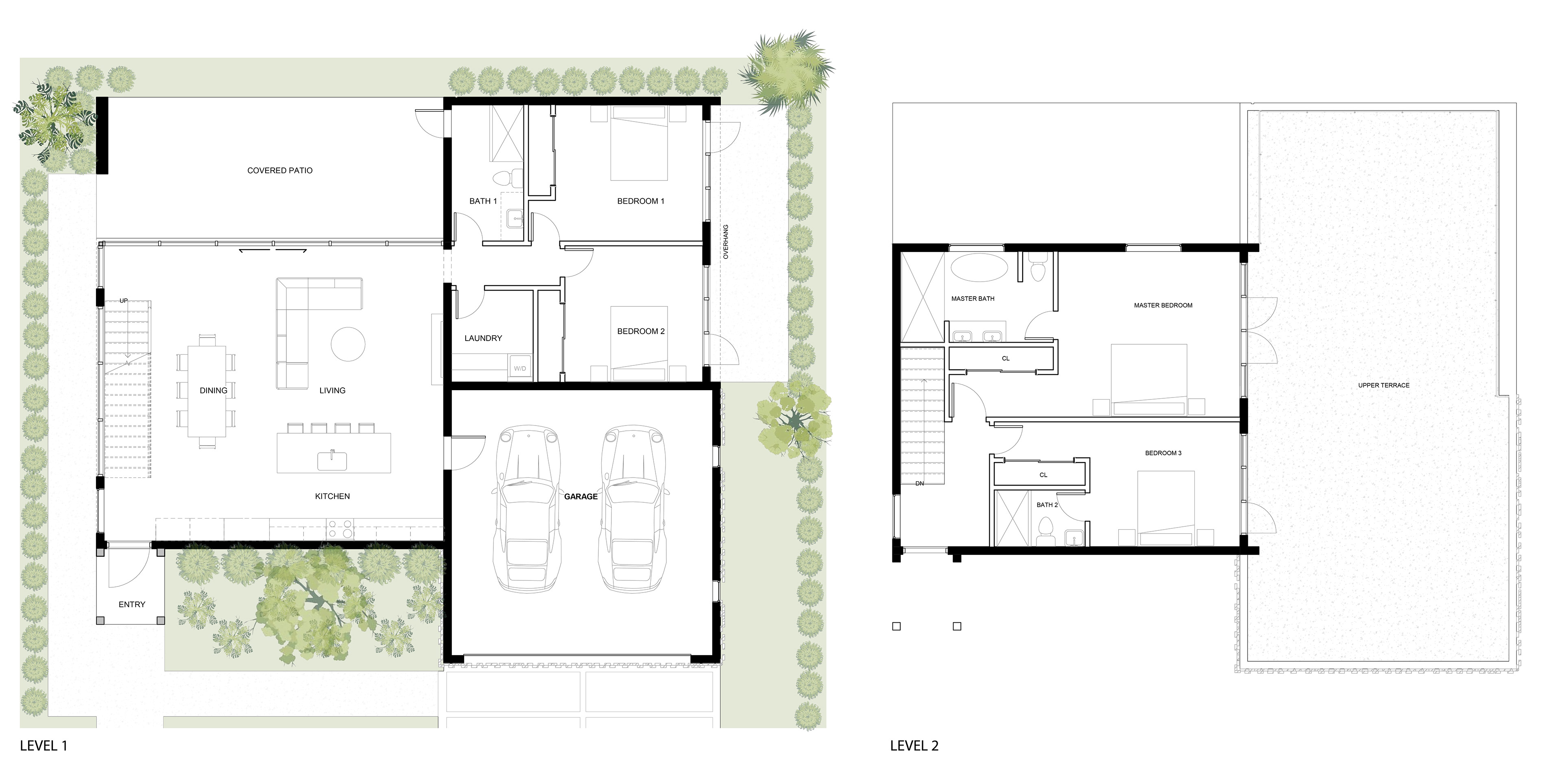The second floor is accessed by a sculptural staircase in the main room. The second floor has the master suite and an additional bedroom. The master site has a vast terrace over the first floor bedrooms. The set up for the terrace allows the user to add more terrace space over the garage to the front and the first floor terrace to the backyard making it customizable.
