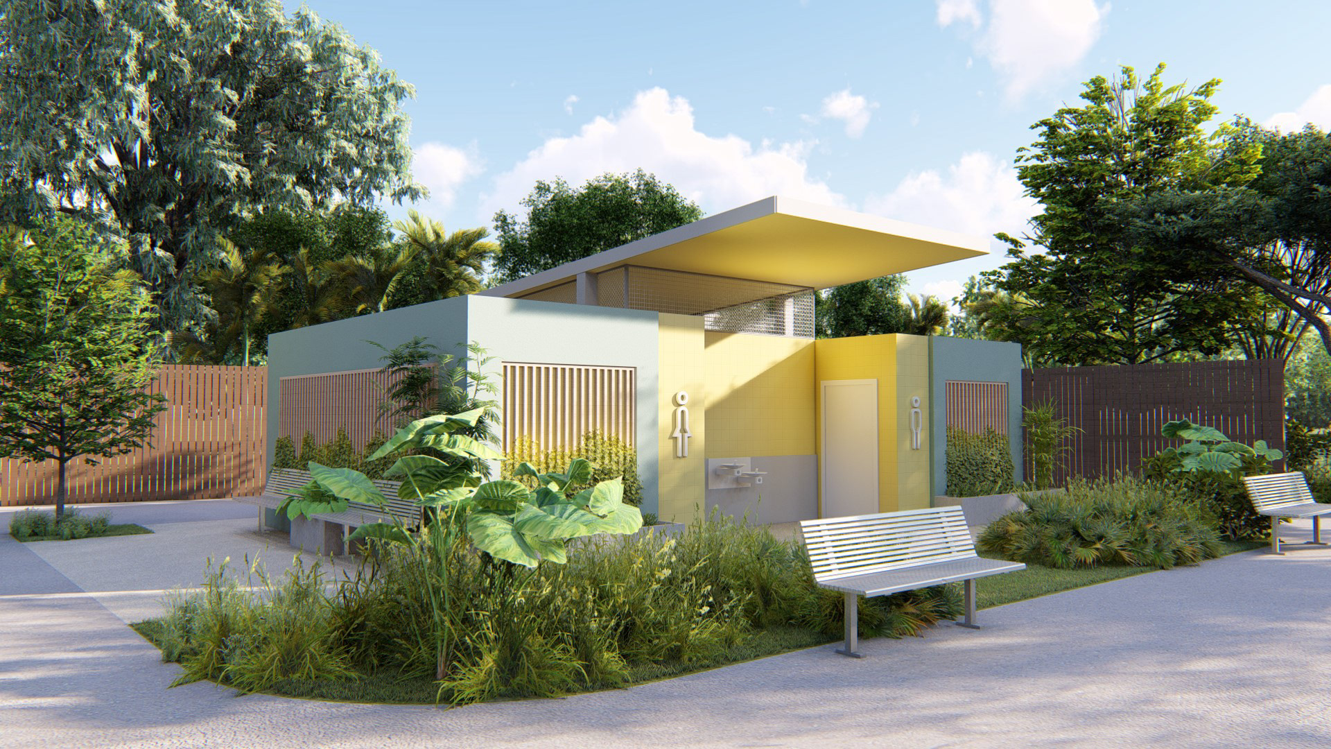 thIS PROJECT focuses on a new public restroom proposal for the city of margate. the design is a tropical modern aesthetic that is durable and will last the test of time. the chosen colors are vibrant and inviting. landscaping is a main component through the use of vines to grow on the walls and proposed planters surrounding the structure.