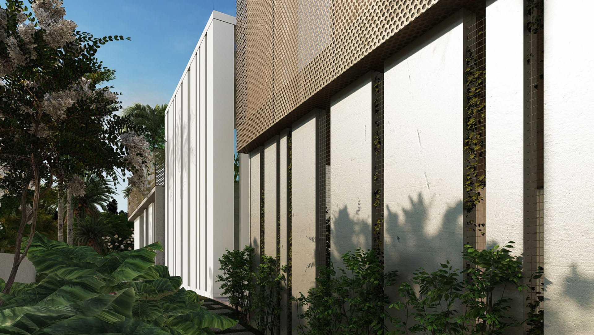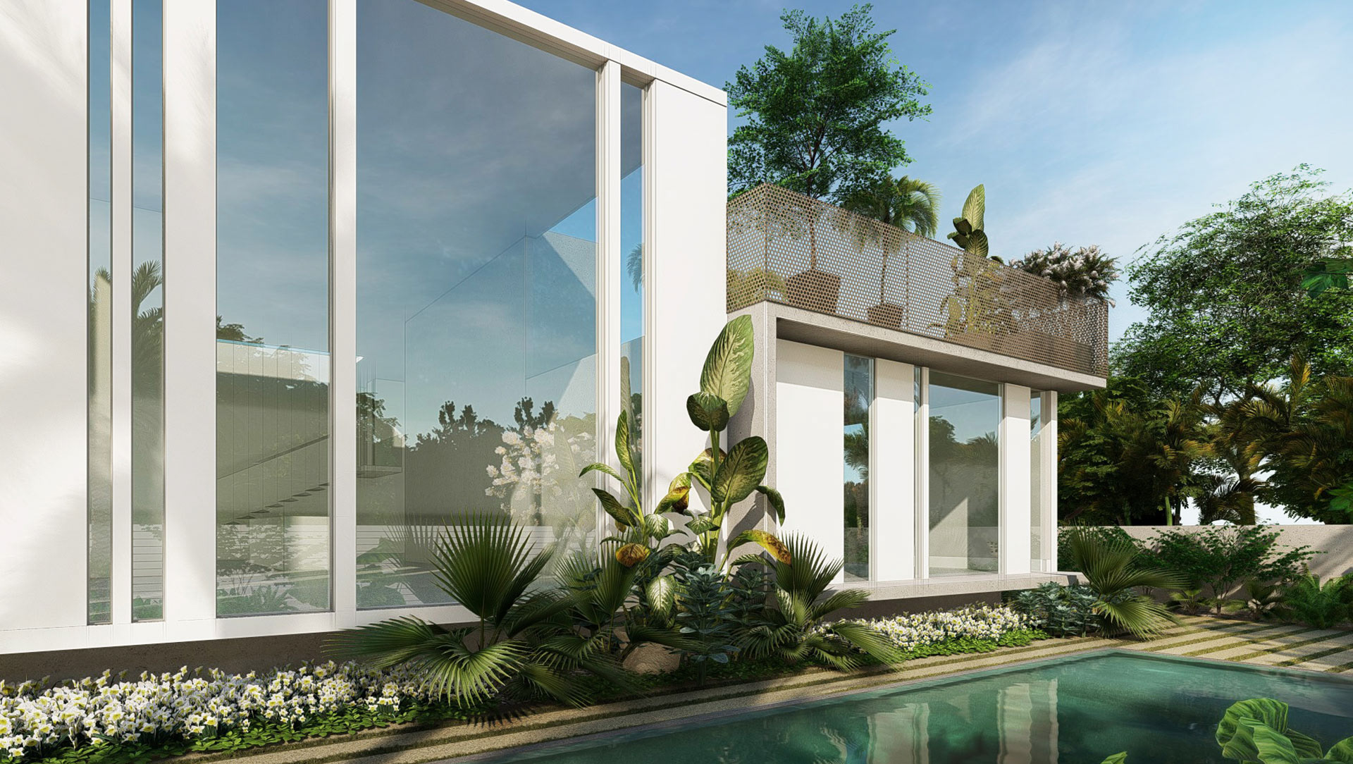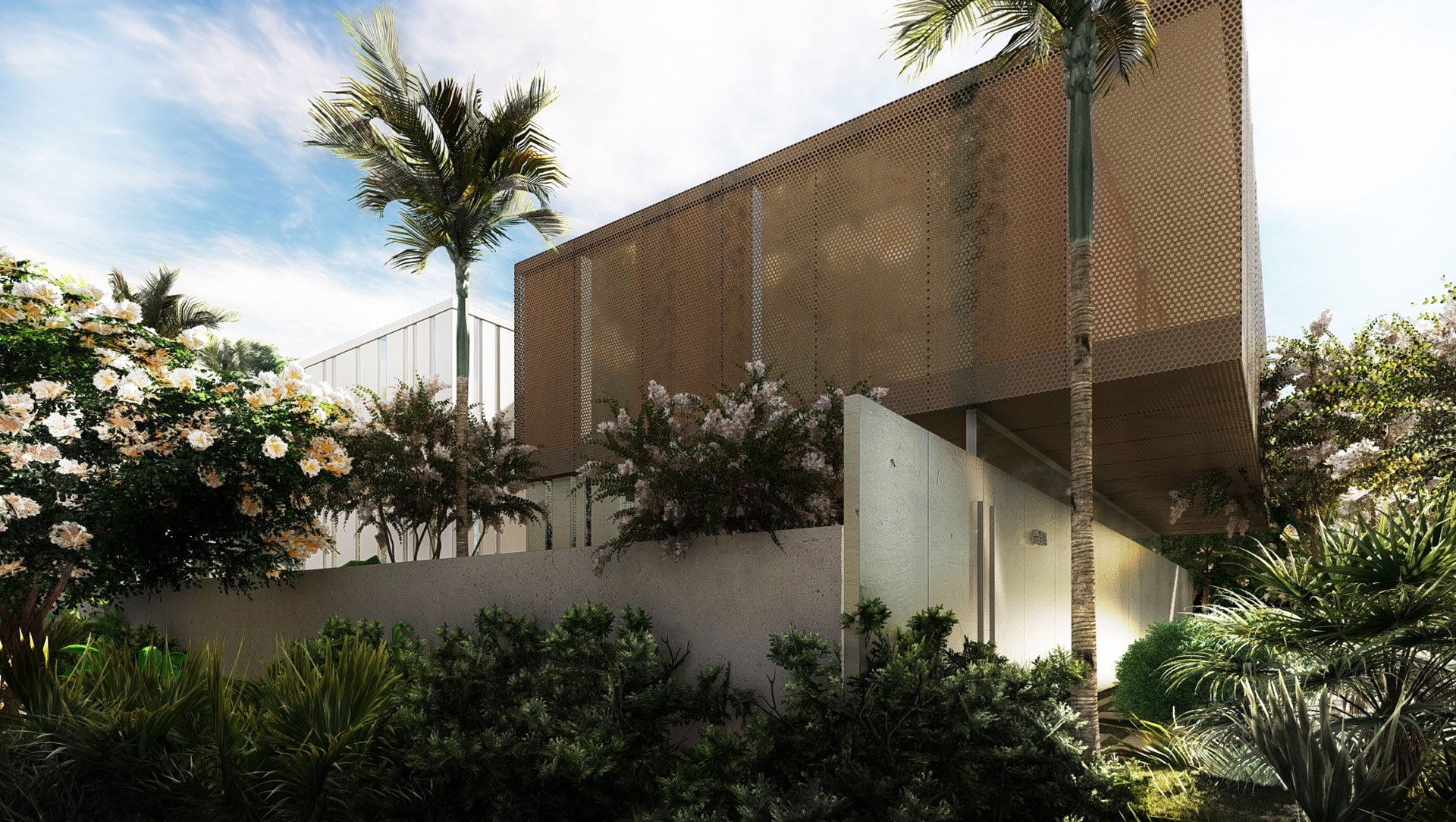 The Pinetree house is a concept in blending the minimal forms of an architecture in contrast with not just its landscape, but also with its infill urban site. As with any new construction in Miami Beach the structure is 100% resilient to rising waters. The interior and exterior work simultaneously in sync as one space blends into another from inside to outside. There has been great care to expose details that delineate the designs flow with the indoor/ outdoor volumes and surfaces. This house is a testament to raw materials blending into the landscape so that the occupant has a constant reflection of the spaces from inside to outside.