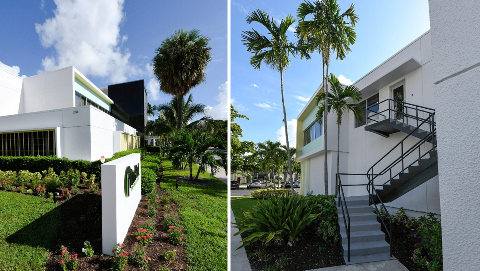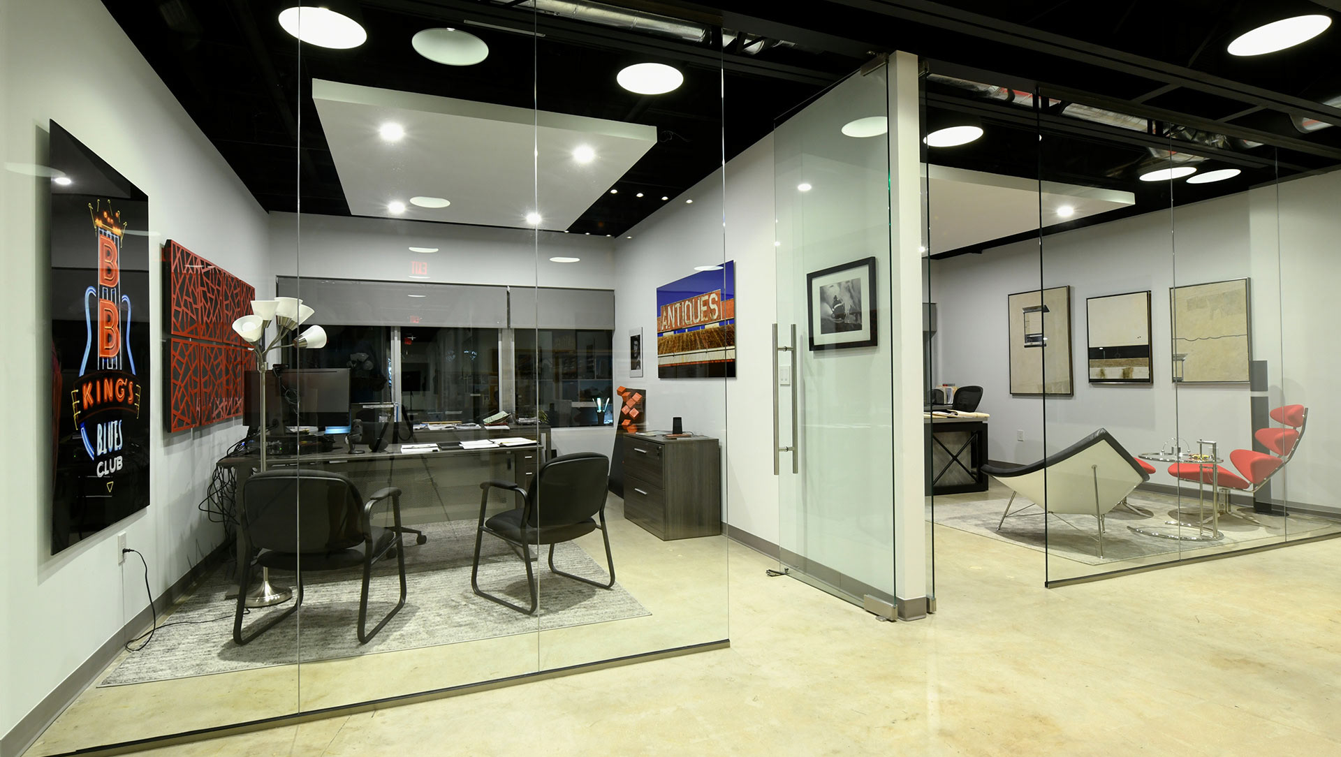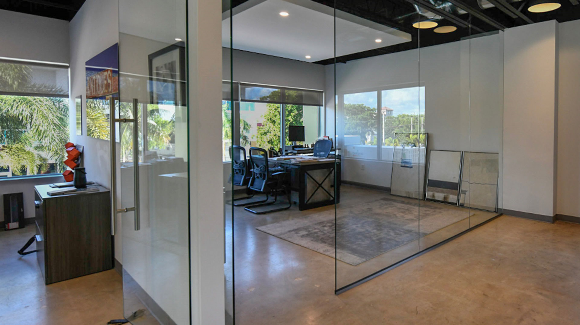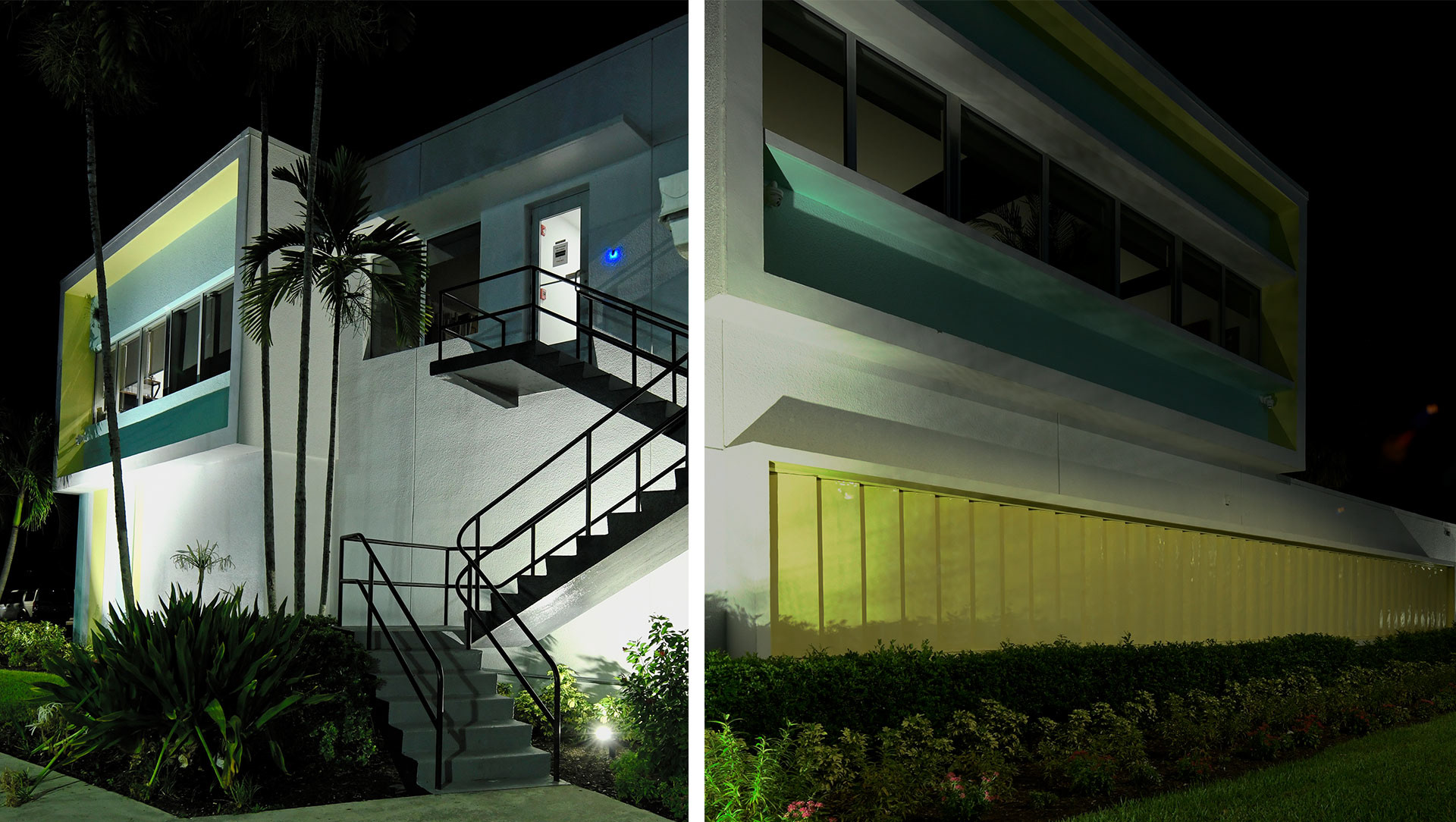 The 200 Lake Avenue building in Lake Worth Beach is a prime example of a true mid century modern building in built in 1956. The original building style and components were preserved to keep all of the pertinent historical features in tact. The design of a new interior compliments the original design in many ways. While looking at the building many of the elements where restored, repaired and used as originally intended. These items included the sliding operable shutters, terraces, the granite building skin, the aluminum windows, the terrazzo floors and interior stair rails. The interior was complemented with a raw concrete floor, glass walls, minimal fittings and mid century modern art and furniture for décor.