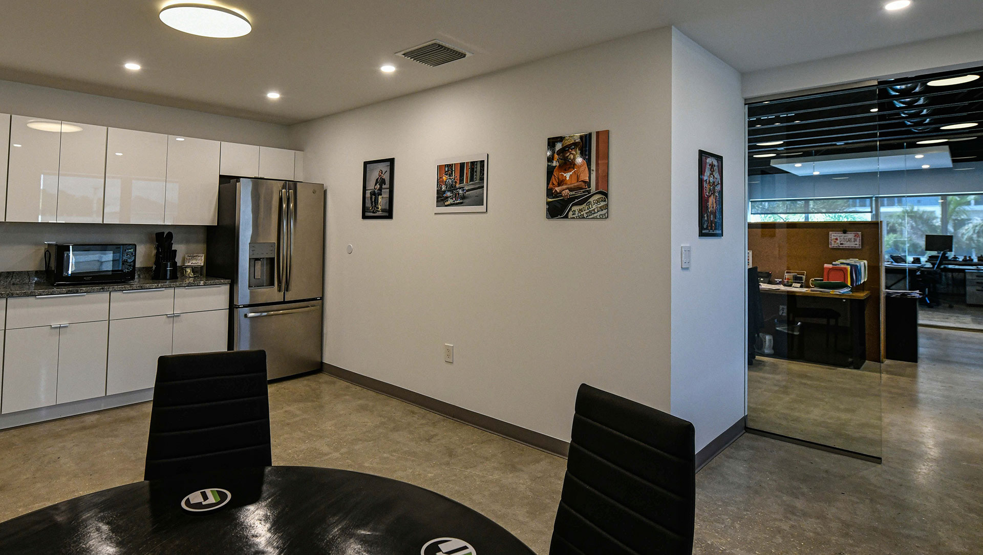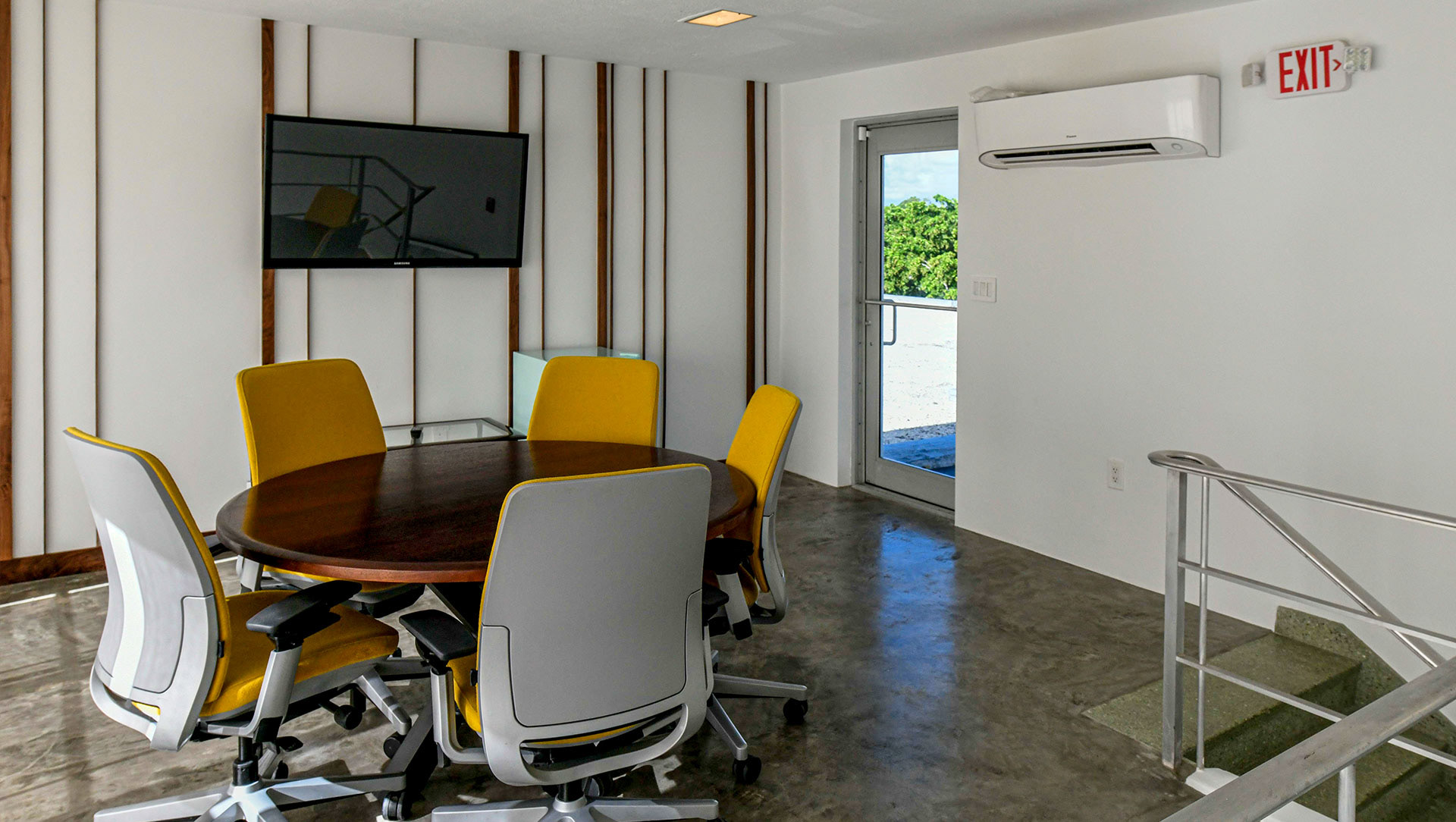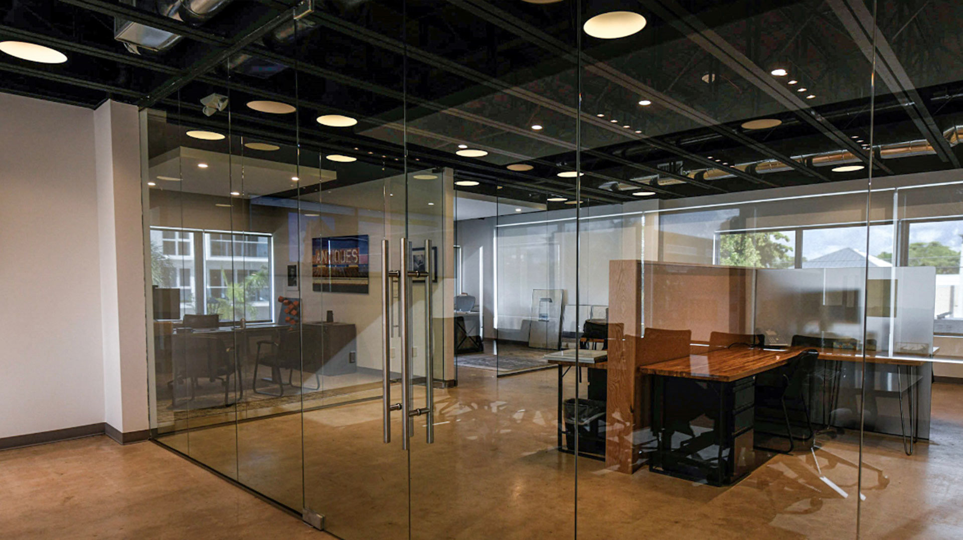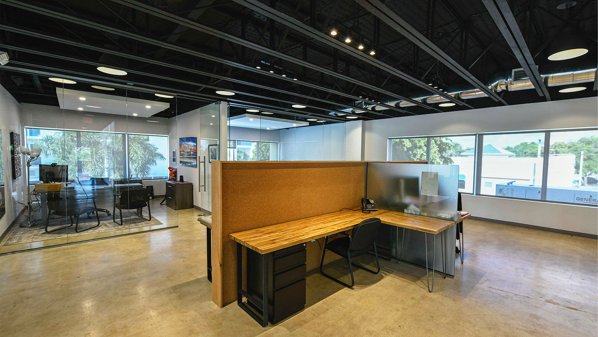 The 200 Lake Avenue building in Lake Worth Beach is a prime example of a true mid century modern building in built in 1956. The original building style and components were preserved to keep all of the pertinent historical features in tact. The design of a new interior compliments the original design in many ways. While looking at the building many of the elements where restored, repaired and used as originally intended. These items included the sliding operable shutters, terraces, the granite building skin, the aluminum windows, the terrazzo floors and interior stair rails. The interior was complemented with a raw concrete floor, glass walls, minimal fittings and mid century modern art and furniture for décor.