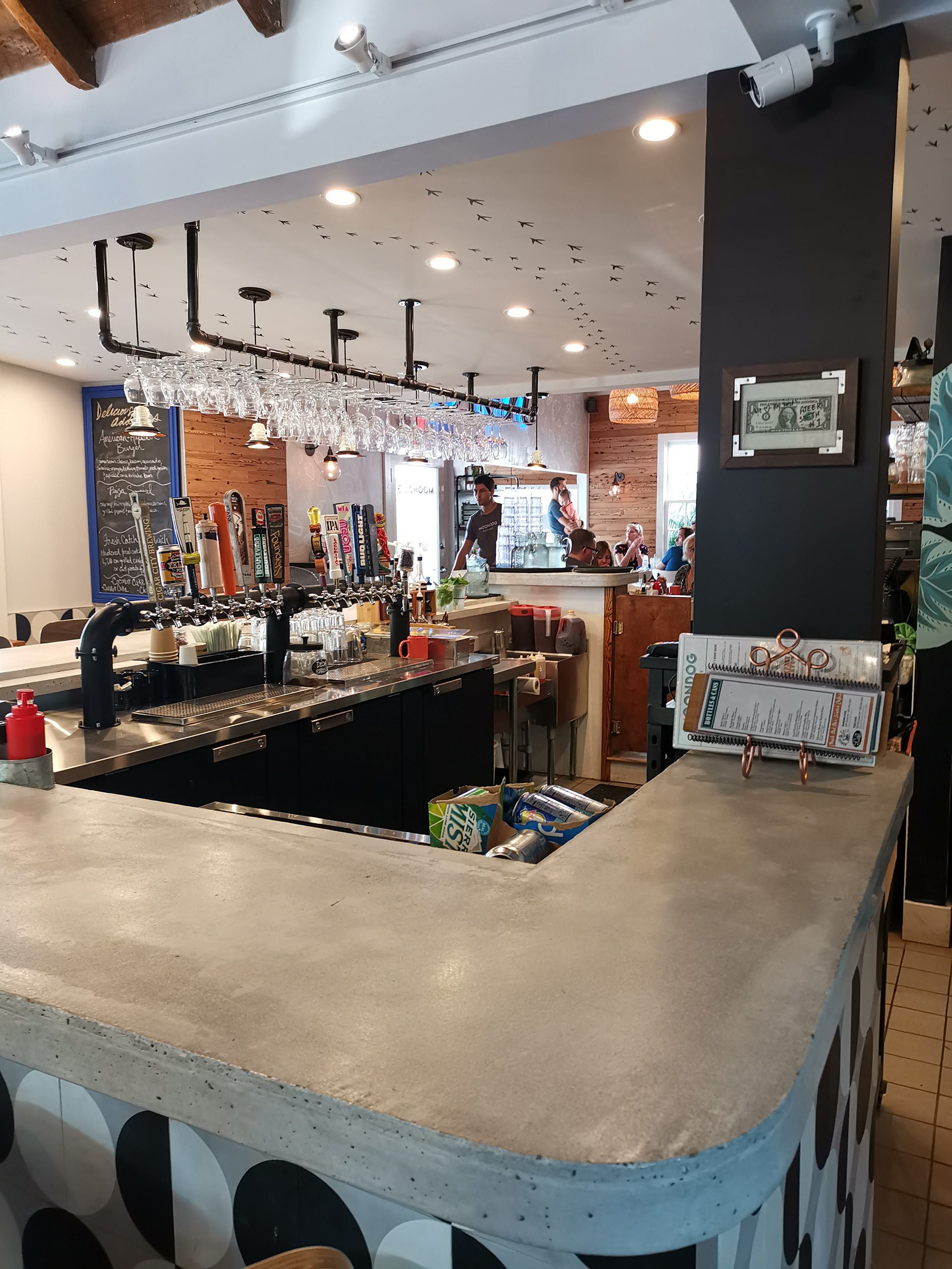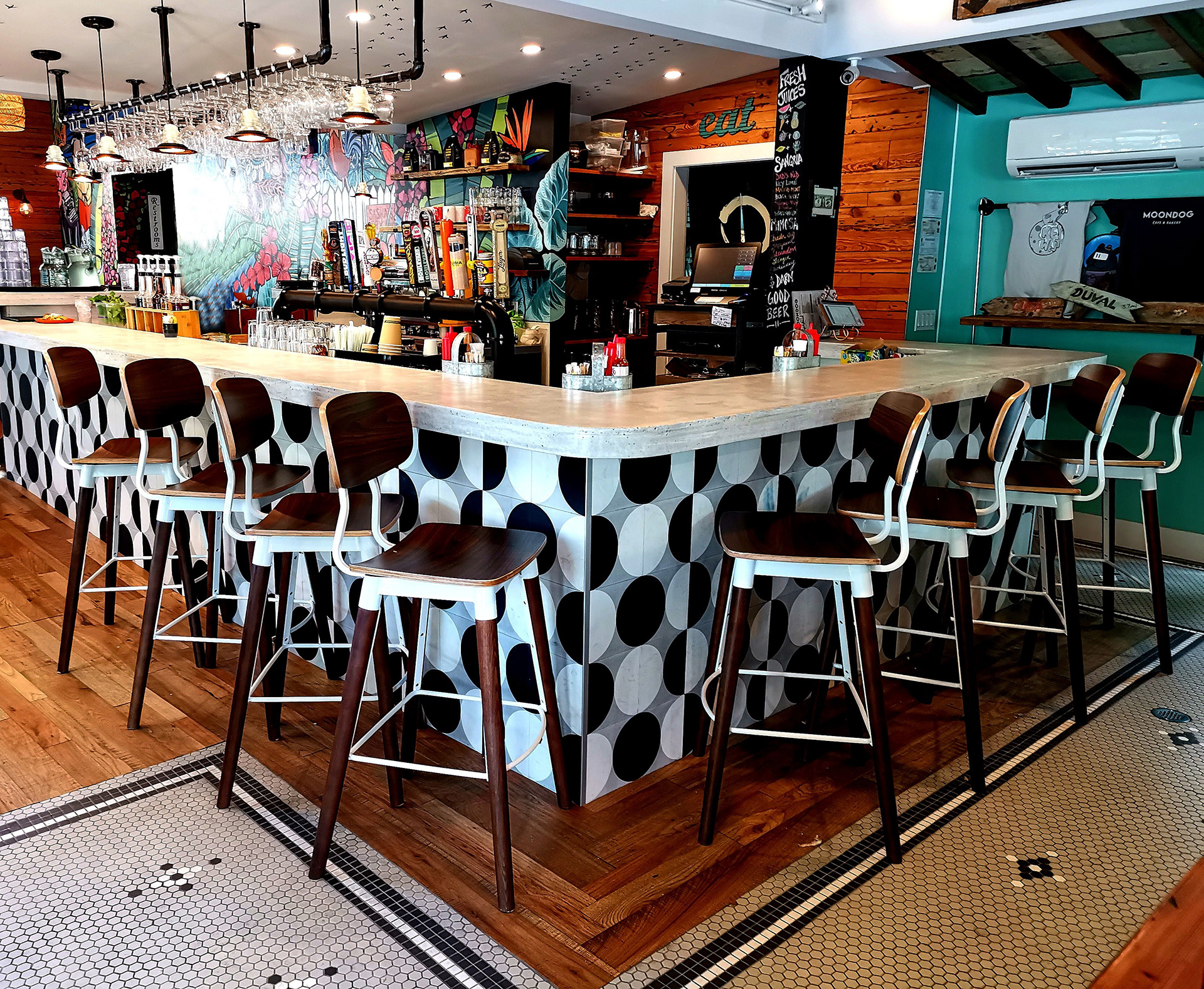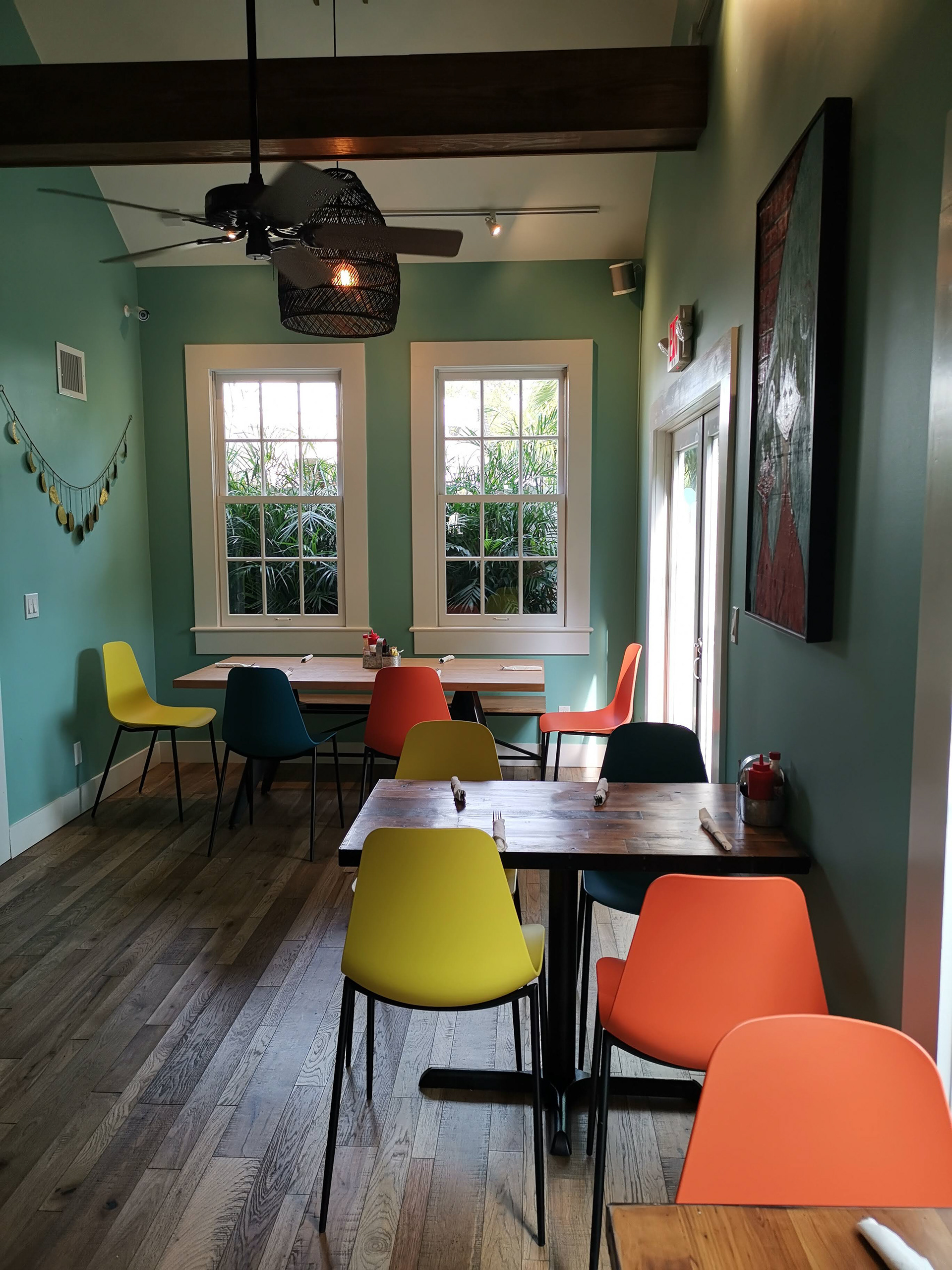 moon dog cafe is the renovation of the existing key west house. tHE ROOF WAS RECONSTRUCTED AND KEPT EXPOSED TO REVEAL THE WOODEN STRUCTURE ON THE CEILING.
