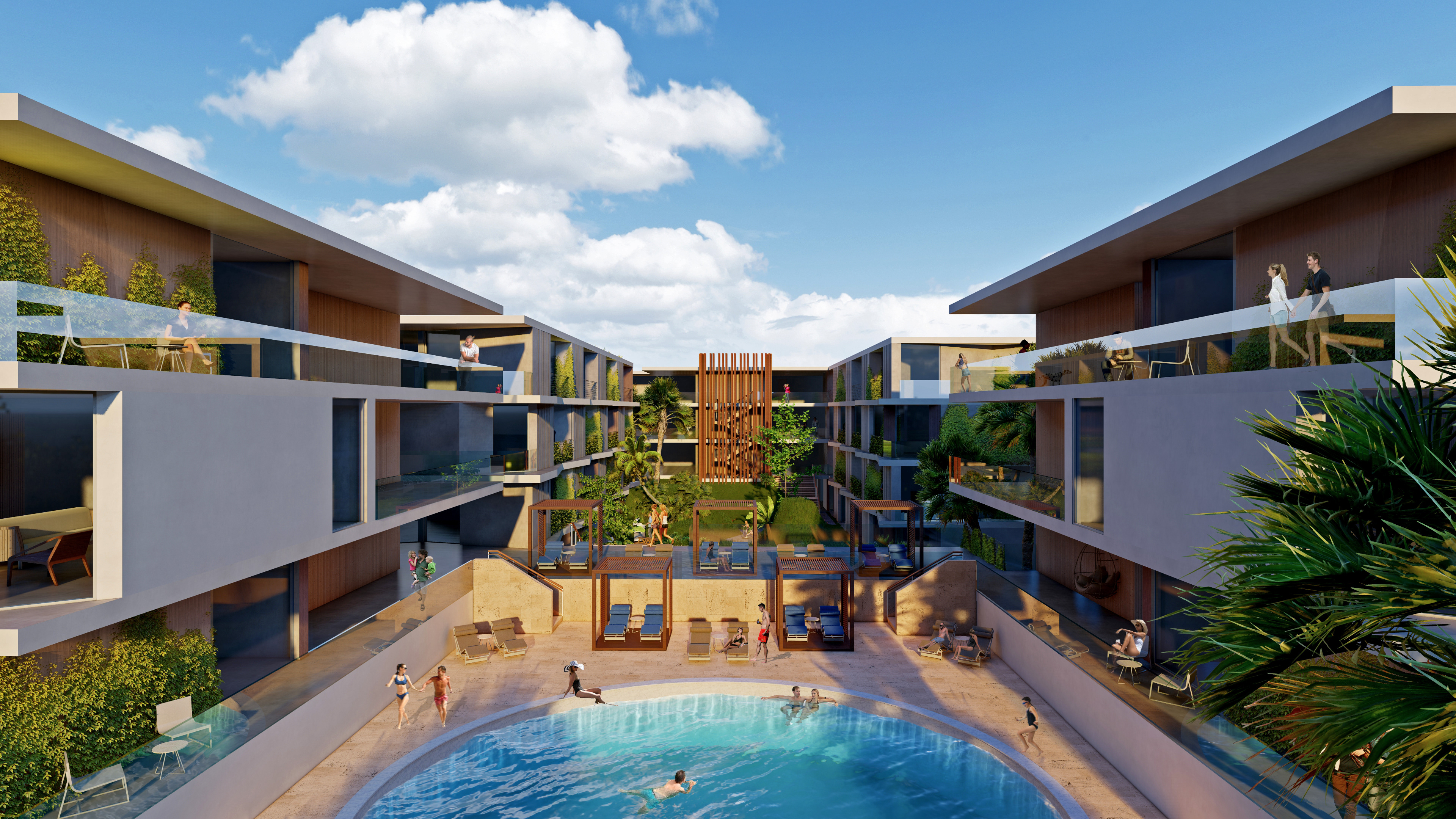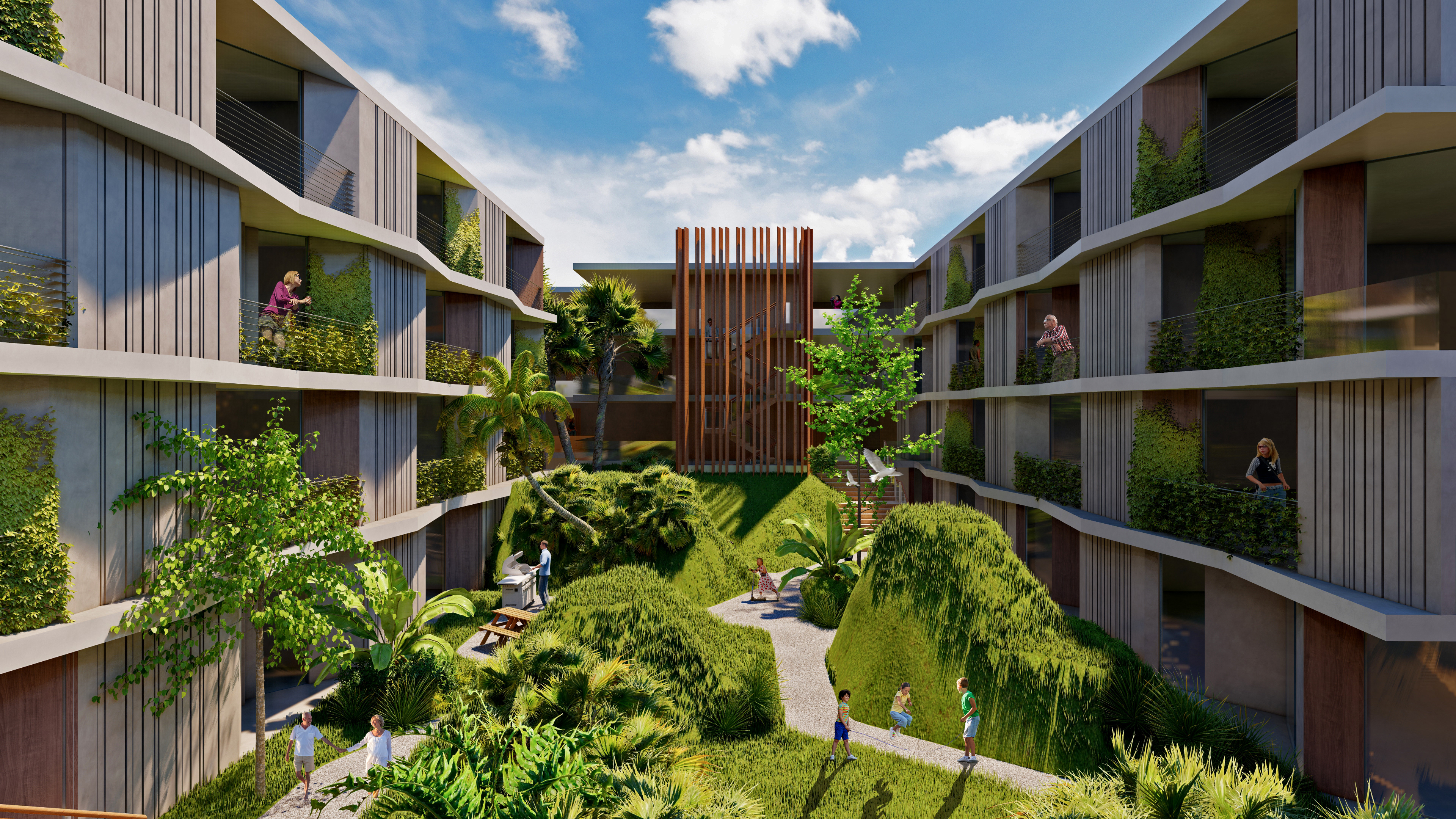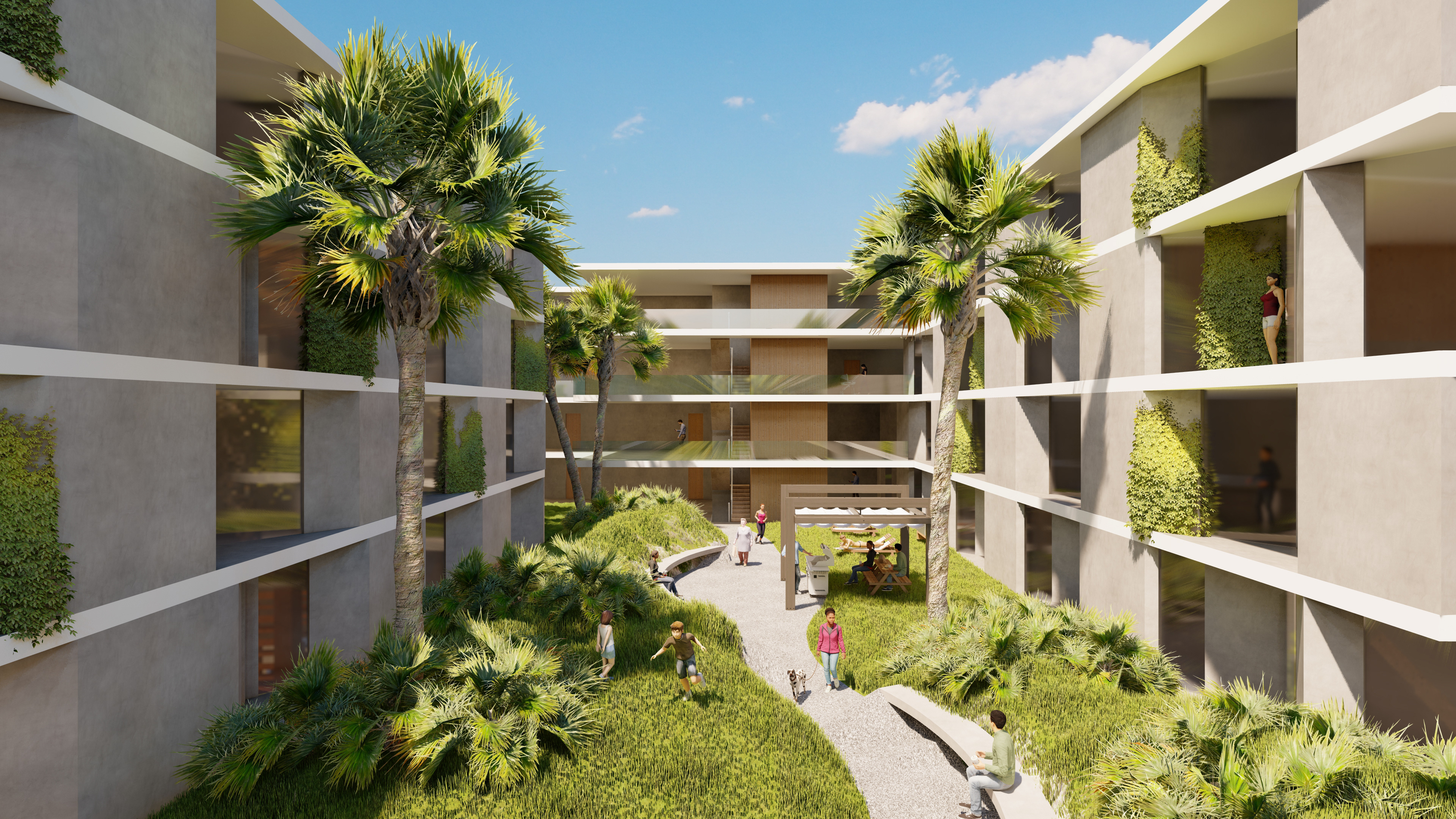 thIS PROJECT focuses on the new construction of 5 STORY APARTMENT COMPLEX WITH 136 WORK FORCE HOUSING units. this project faces a florida natural scrub area. The concept was to bring the landscape into the building by creating an internal courtyard. The pool faces the scrub areas on one side and the internal garden on the other. provides a diversity of unit placements that allow for varied prices for different income levels.