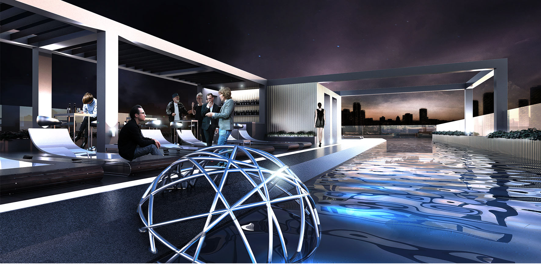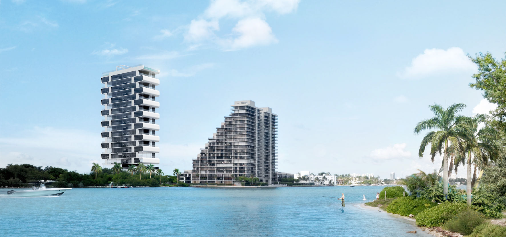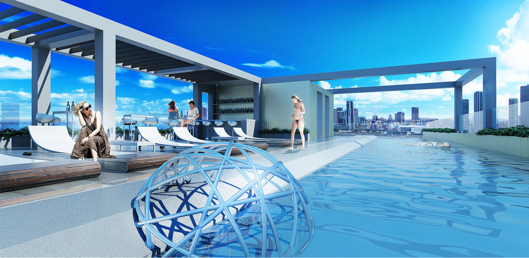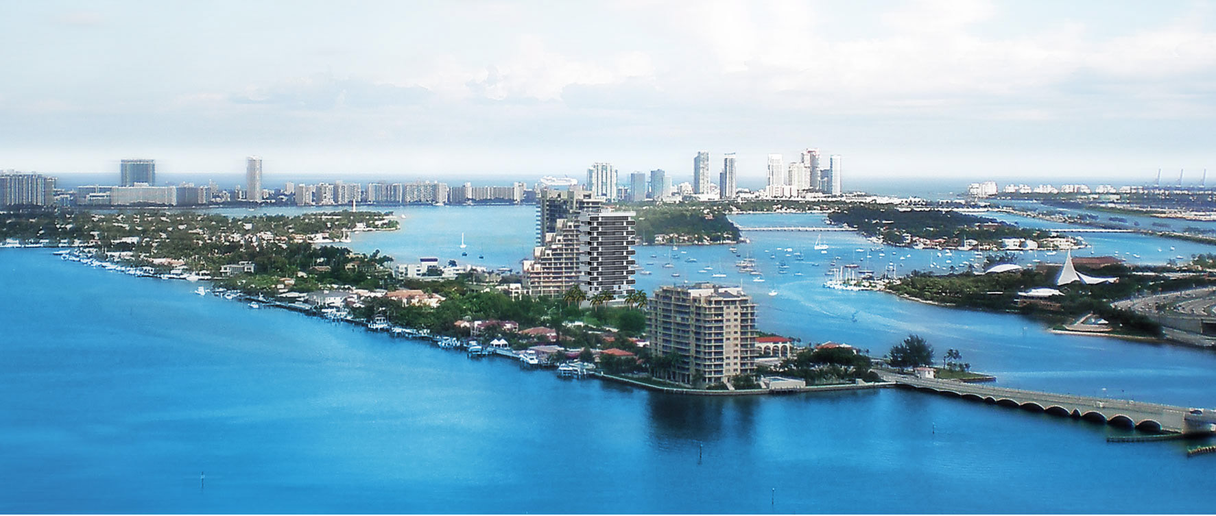 The Venetian is a residential tower based in the center of Miami bay. It is a 16 story tower in which each floor is a penthouse private apartment. The building is designed to provide optimum views to all sides of the bay while it also provides optimum privacy. Each floor opens up to the bay on all its sides boasting a terrace and dramatic views from the every room in the building. The bathrooms present minimal fixtures by “Cosmic” which blend into the minimal feel of the building shell. The building is also equipped with a system of rolling shades for privacy, shade and sunlight. The Biscayne also has a two story interior/ exterior garden entry area with a gym and café area as well as a roof pool for residents and guests.