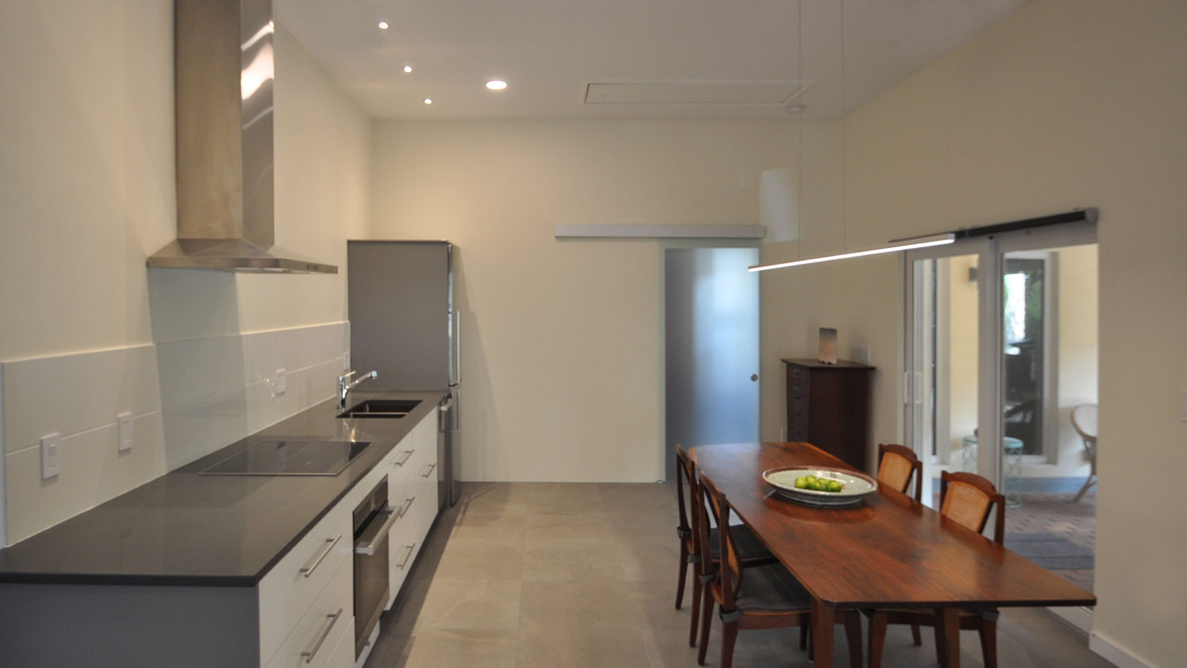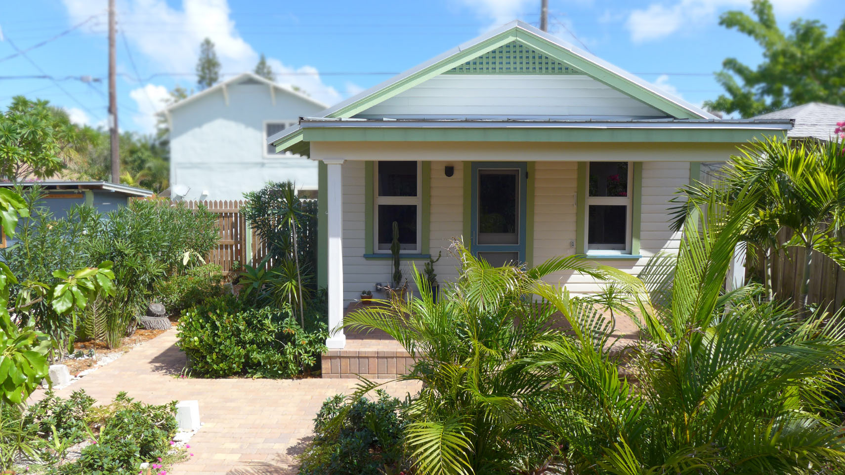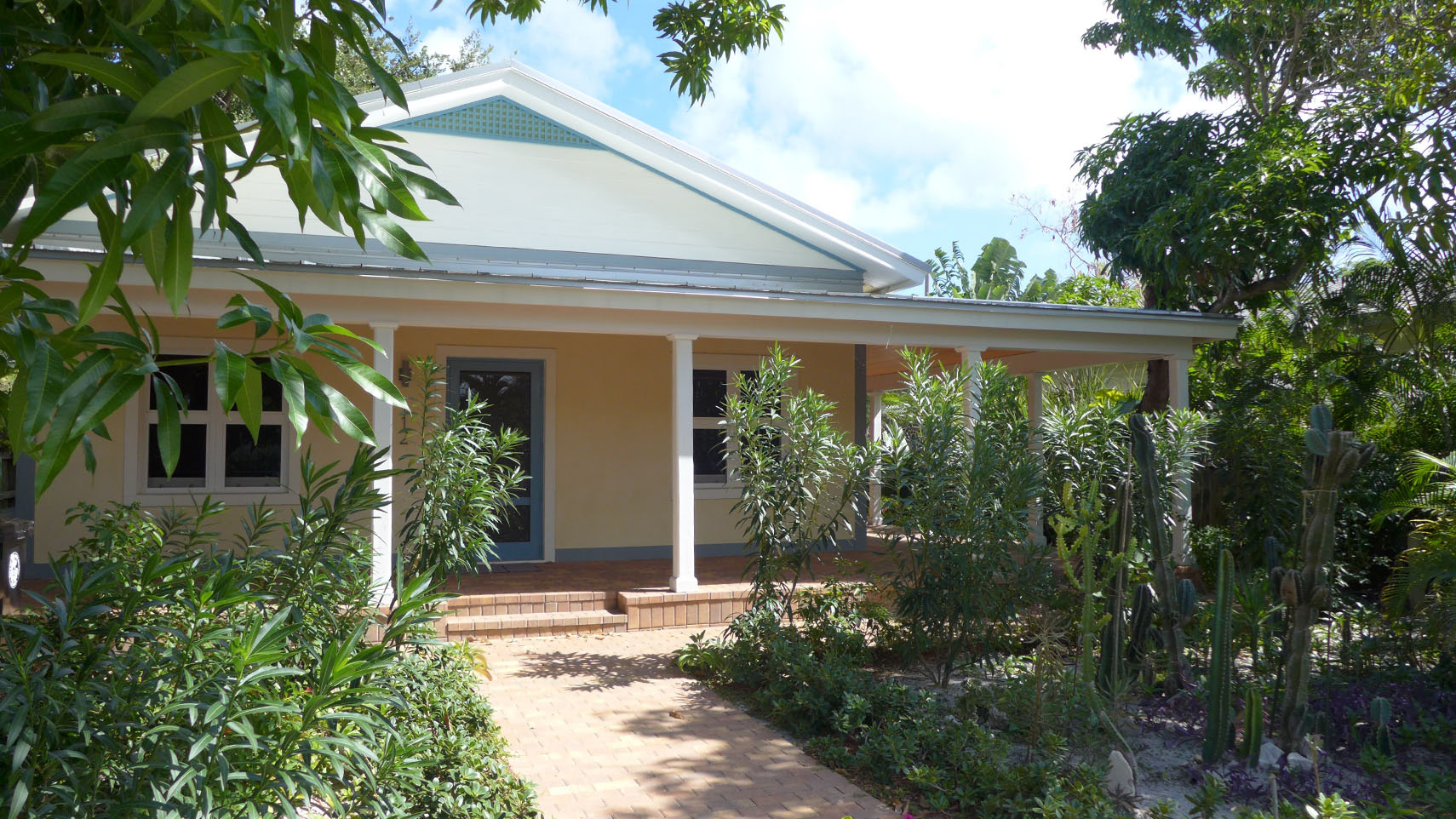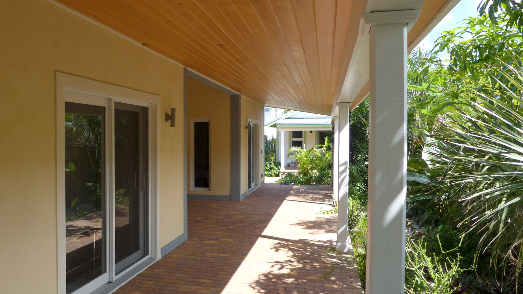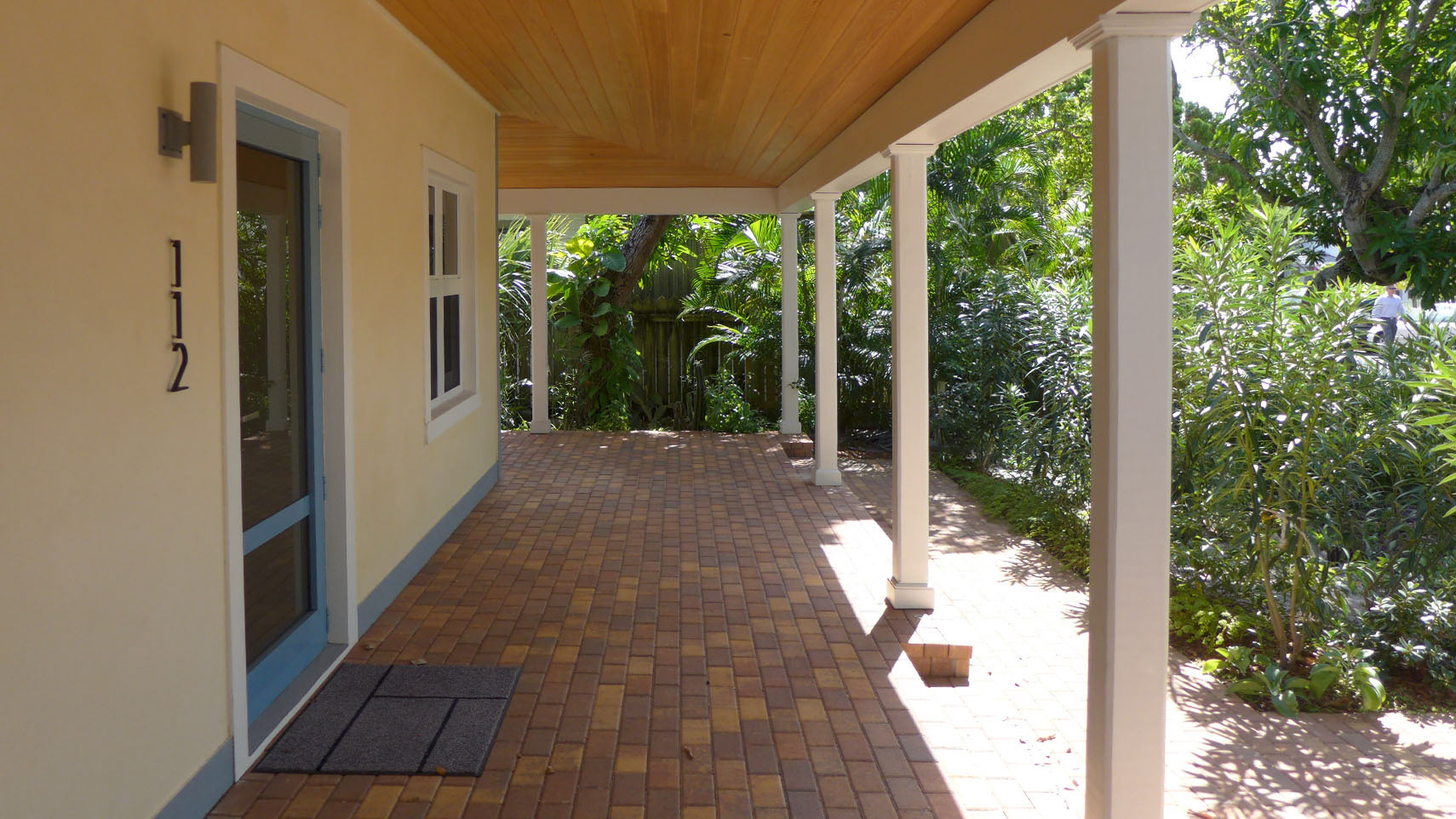A 1929 wood-framed cottage was rescued from decay and rebuilt as a guest house. The exterior retains original siding and conforms with the strictures of the local Historic District designation. In addition to restoring and slightly modifying the existing cottage, the main structure was designed to accommodate the lifestyle for the clients. The concept was to provide a minimal, but open, one bedroom, one thousand square foot home. The interior ceiling heights vary from high in the living area and bedroom to lower in the kitchen, allowing for task lighting and storage. A seven hundred square foot wrap-around porch allows for ample outdoor living spaces while protecting the southern façade from direct sunlight. The various glass windows and doors allow for an interesting play of light throughout the interior spaces. Both the historical and new structures are unified with a continuous brick walkway that integrates with the landscaping.