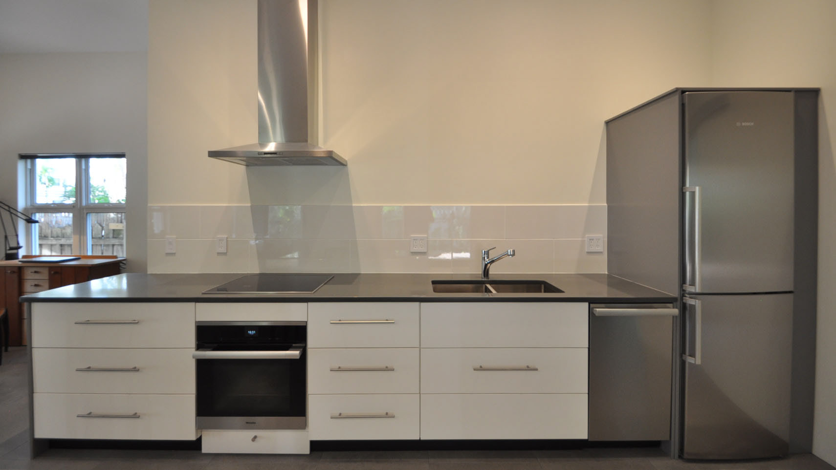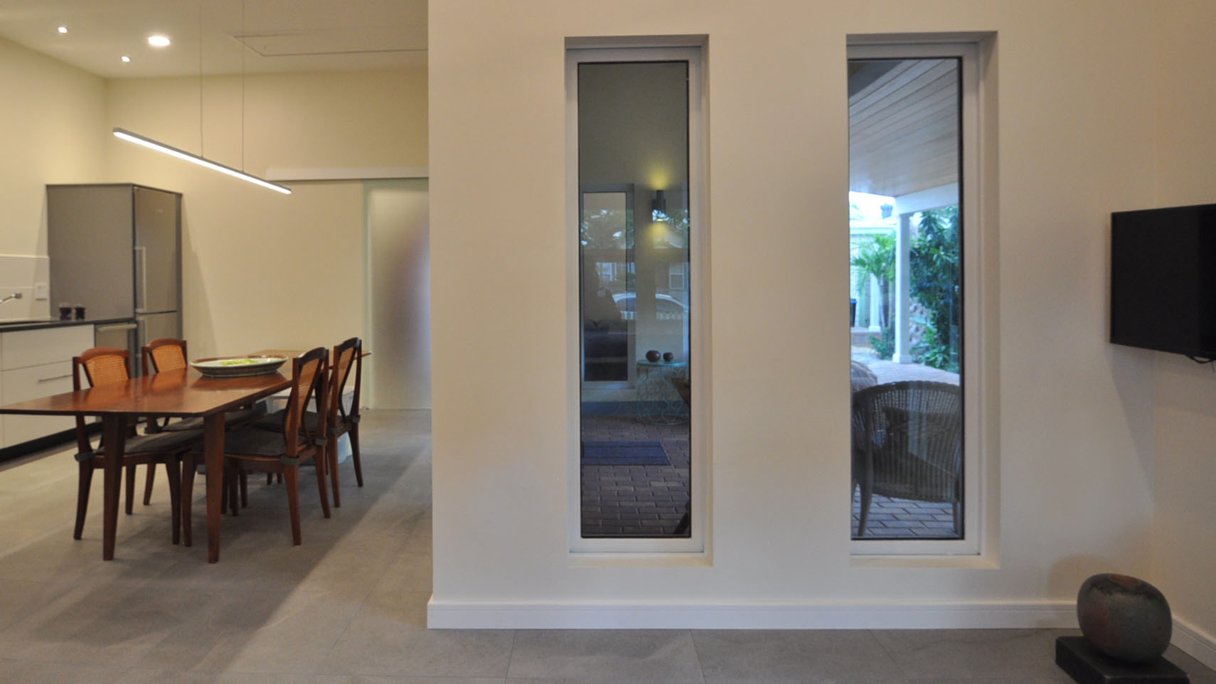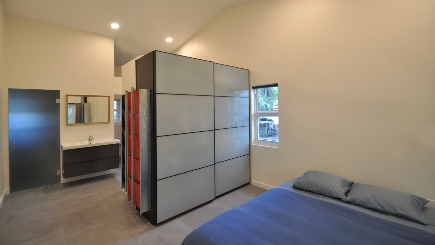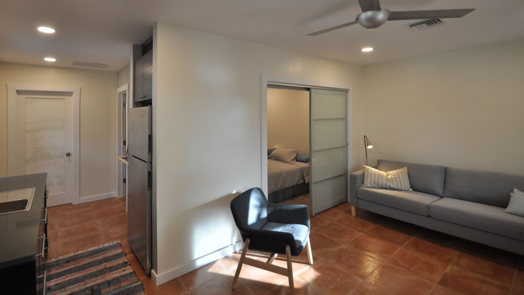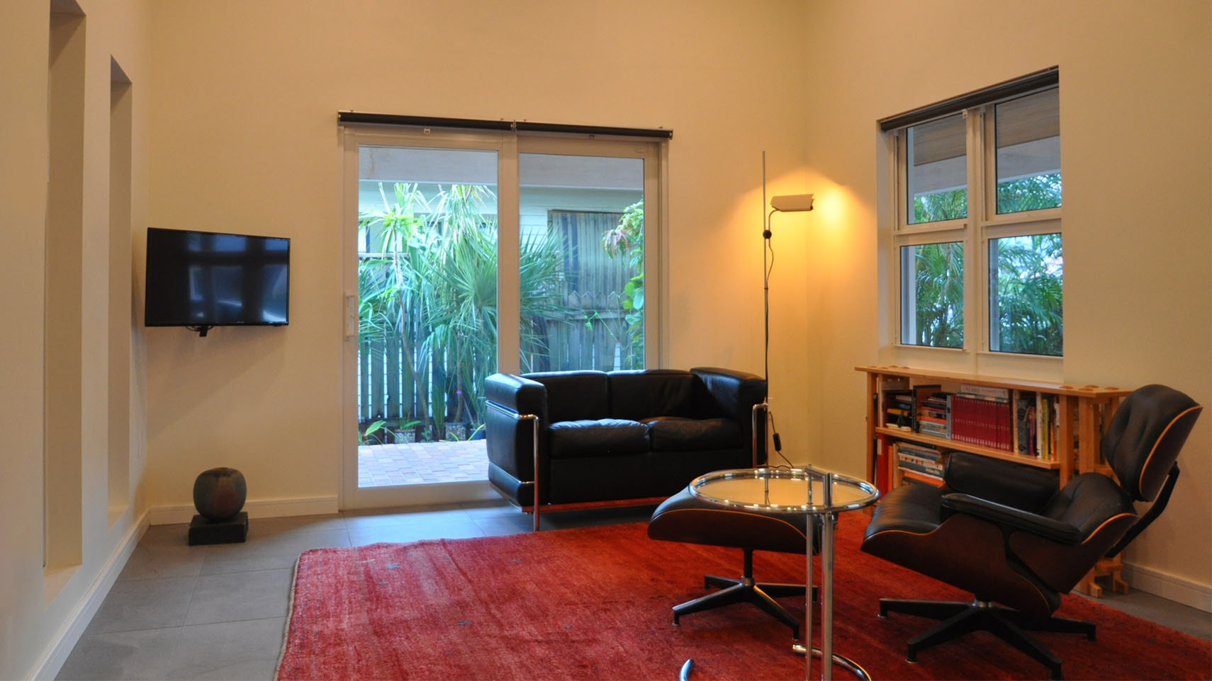 A 1929 wood-framed cottage was rescued from decay and rebuilt as a guest house. The exterior retains original siding and conforms with the strictures of the local Historic District designation. In addition to restoring and slightly modifying the existing cottage, the main structure was designed to accommodate the lifestyle for the clients. The concept was to provide a minimal, but open, one bedroom, one thousand square foot home. The interior ceiling heights vary from high in the living area and bedroom to lower in the kitchen, allowing for task lighting and storage. A seven hundred square foot wrap-around porch allows for ample outdoor living spaces while protecting the southern façade from direct sunlight. The various glass windows and doors allow for an interesting play of light throughout the interior spaces. Both the historical and new structures are unified with a continuous brick walkway that integrates with the landscaping.